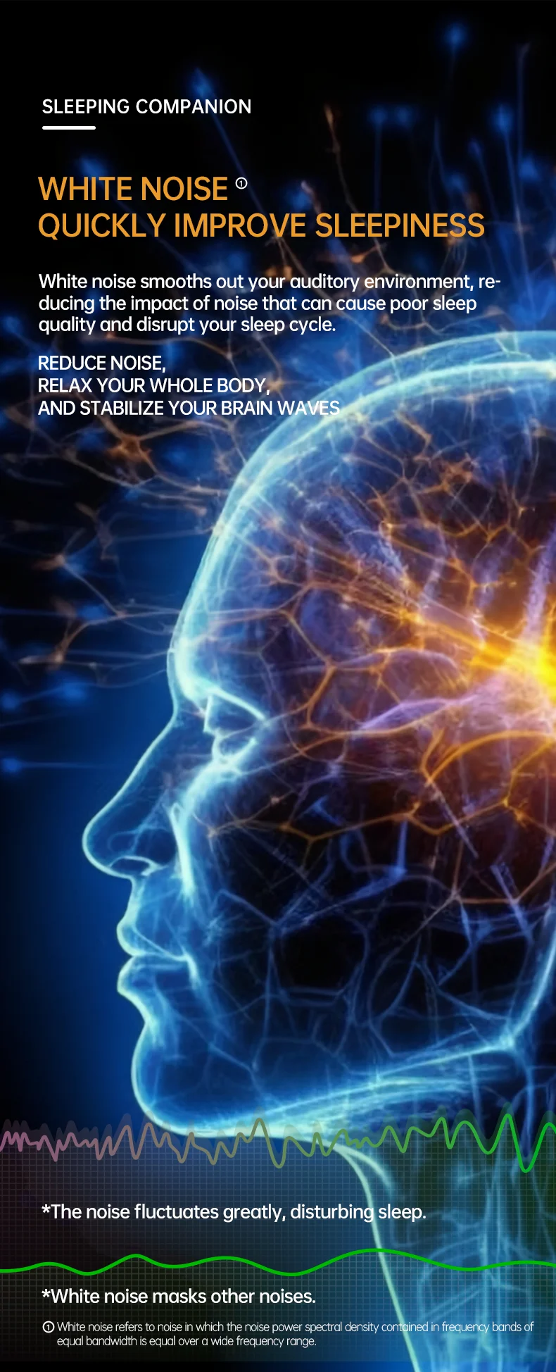 White noise smooths out your auditory environment, re- ducing the impact of noise that can cause poor sleep quality and disrupt your sleep cycle.