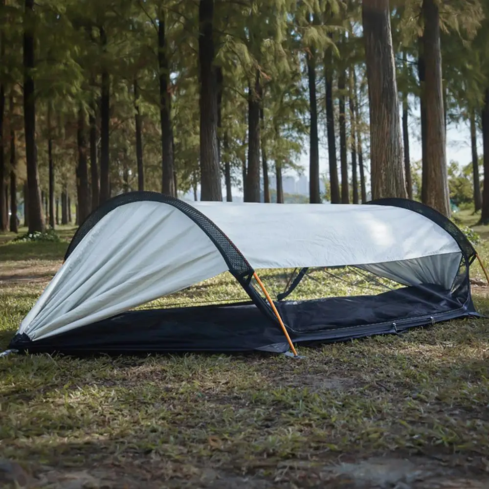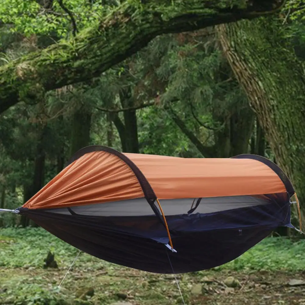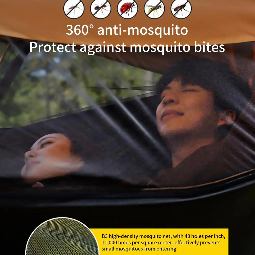 Easy Setup: Hang our hammock tent as a normal hammock, then put in 2 aluminum poles to support the protective mesh, tie 2 elastic ropes for balance, and finally put it on the rainfly, then you will have a lot of fun inside.