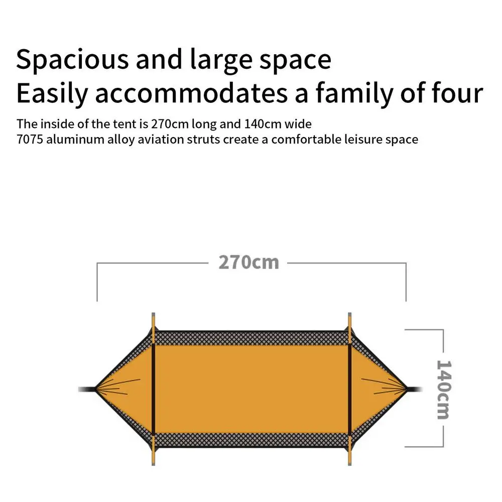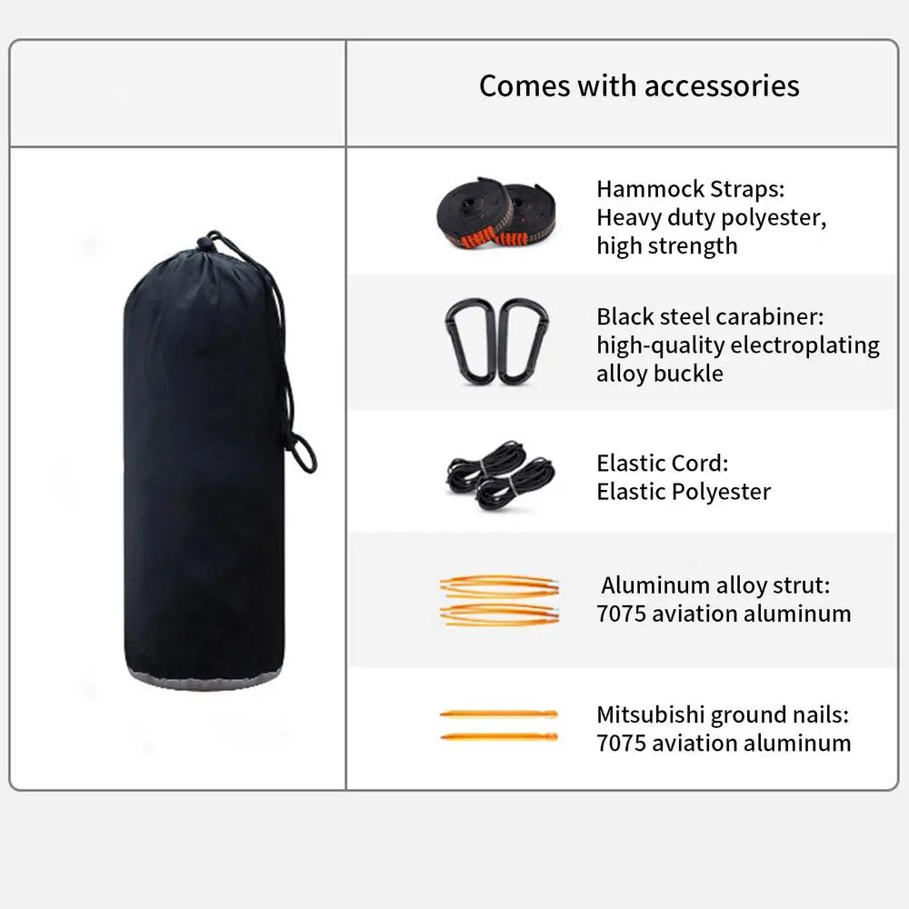 Lightweight And Portable: Our hammock is perfect for outdoor backpacking, camping, or indoor storage.Spacious and large space: a family of four can easily carry the tent. The length of the tent is 106.3in, the width is 55.12in, and the 7075 aluminum alloy aviation struts create a comfortable and leisurely space.